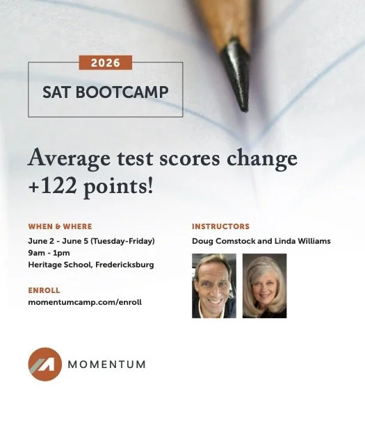 For 2026 we will be offering our SAT Bootcamp Tuesday June 2 — Friday June 5 at Heritage School, in Fredericksburg.